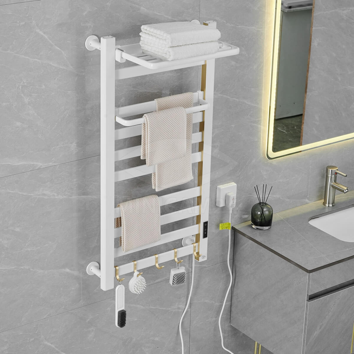 Полотенцесушитель электрический Loder 49*96 см с вешалкой - это стильное и функциональное решение для вашей ванной комнаты. Размеры составляют 480 мм (ширина) х 960 мм (высота) х 220 мм (полка) х 100 мм (от стены). Он имеет степень водонепроницаемости IPX4 и может быть подключен справа. Длина шнура питания составляет 150 см. Вы можете регулировать температуру от 35 ℃ до 60 ℃. Гарантируется безопасность использования благодаря замкам безопасности для детей и постоянной температуре.